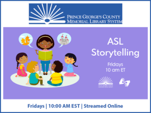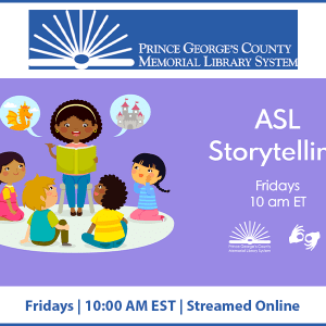Join Prince George’s County Memorial Library System’s weekly virtual storytelling in ASL event for ASL speakers. Voice over narration will be provided. Go to the library website for the virtual
