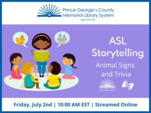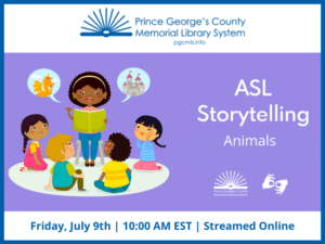Join Prince George County Memorial Library System’s virtual storytelling in ASL event for preschoolers and elementary aged children. Voice over narration will be provided.