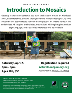 Get cozy in the nature center as you learn the basics of mosaic art with local artist, Ellen Mansfield. She will show you how to make handshape ILY (I love