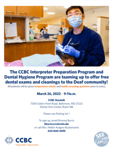 The CCBC Interpreter Preparation Program is joining forces with the Dental Hygiene program! They are inviting the deaf community to join them and get a free dental cleaning! This event is held on Saturday, March 26th.