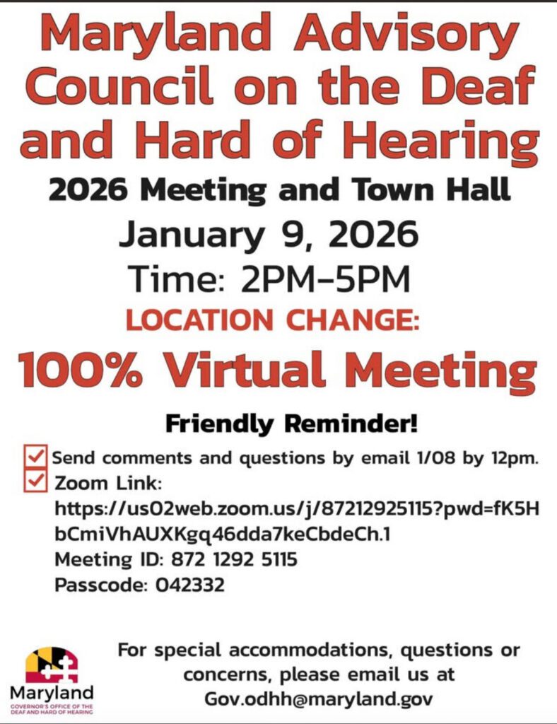 The Maryland Governor’s Office of the Deaf and Hard of Hearing is hosting three town hall meetings to discuss community issues and gather feedback. The sessions include both in-person and virtual options, offering opportunities for participants to share their ideas and suggestions. Meetings will be held on: