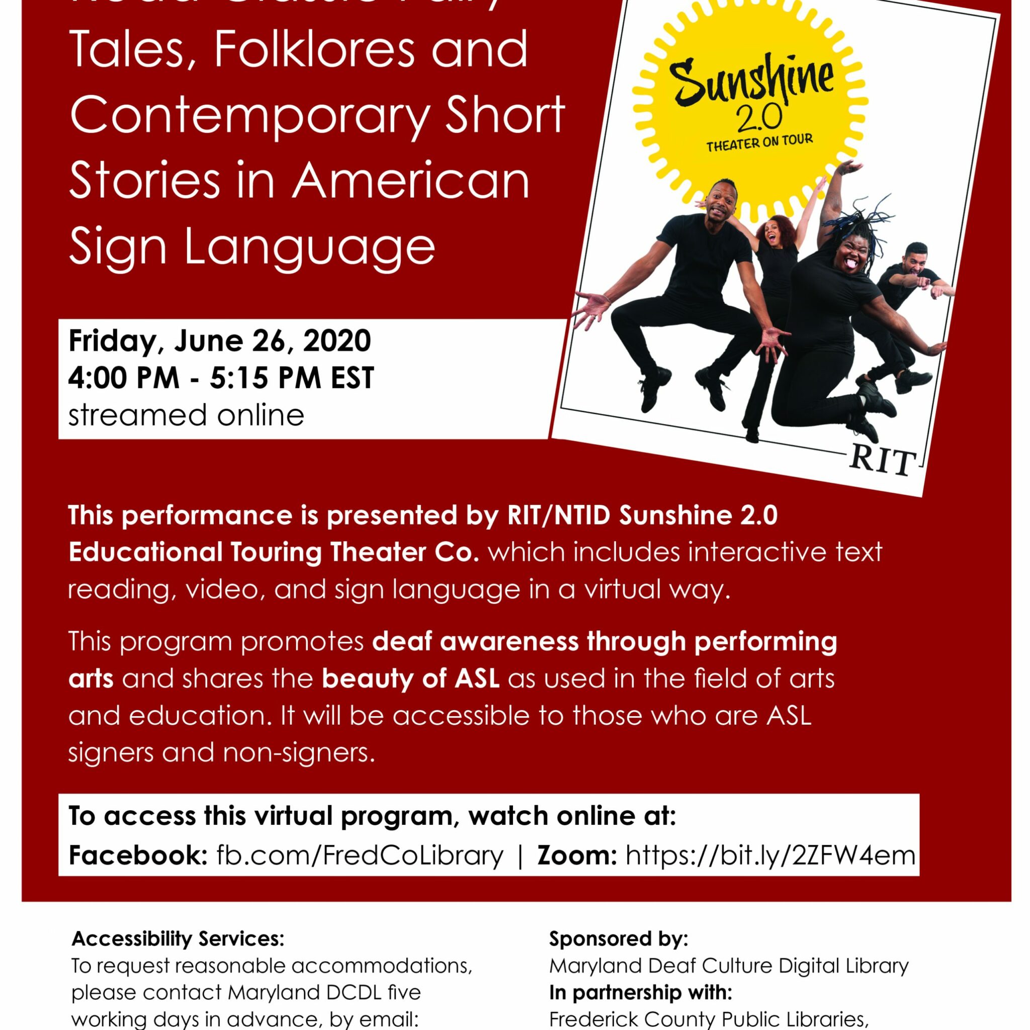 This performance is presented by RIT/NTID Sunshine 2.0 Educational Touring Theater Co. which includes interactive text reading, video, and sign language in a virtual way.