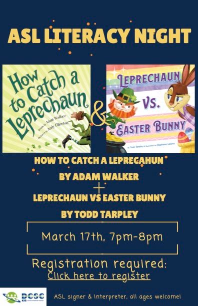 ASL Literacy Night: How to Catch a Leprechaun and Leprechaun vs Easter Bunny Mar 17 8:00 PM ASL Literacy Night: How to Catch a Leprechaun and Leprechaun vs Easter Bunny