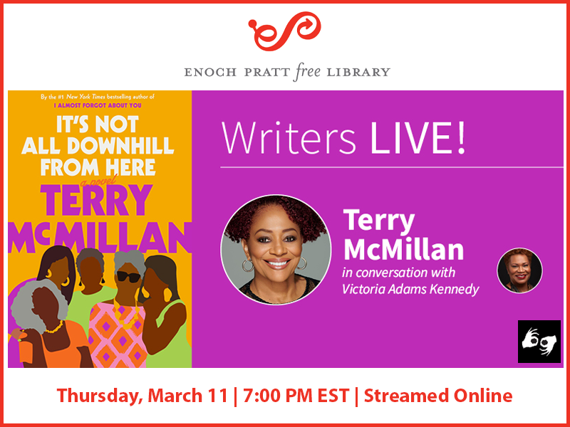 Writers LIVE! Terry McMillan, It’s Not All Downhill From Here Mar 11 7:00 PM - 8:00 PM Writers LIVE! Terry McMillan, It’s Not All Downhill From Here